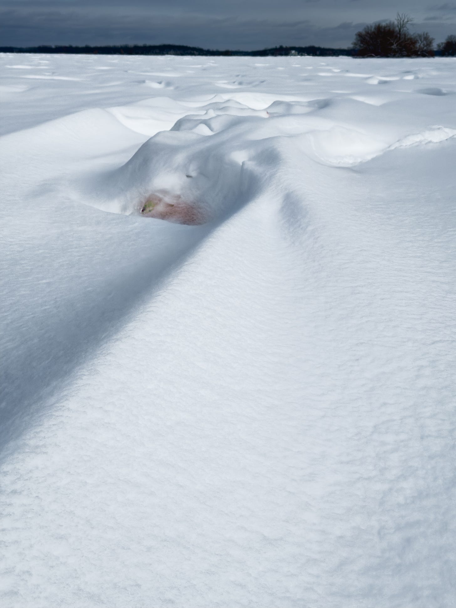 Due to the depth of snow and the extreme winds I knew I’d have to create a 3D work to make it last as long as possible. So I shovelled for 6 hours one day, then re-shoveled the same area 6 hours the next. In literally — according to the news — the coldest part of the entire world that day. (You can see the polar vortex rolling in on the horizon in the top photo). More than forty degrees below zero in the wind (60mph+).