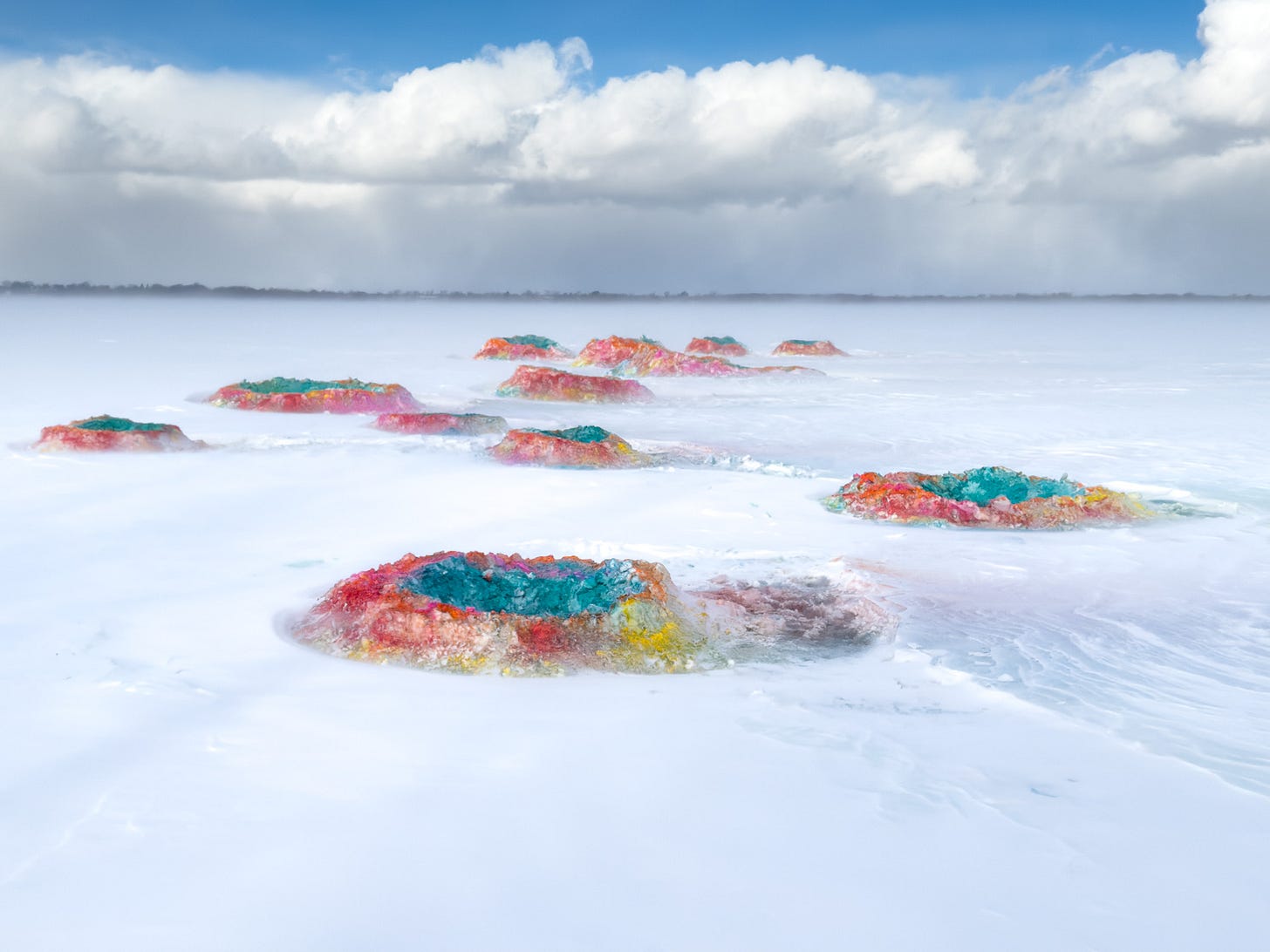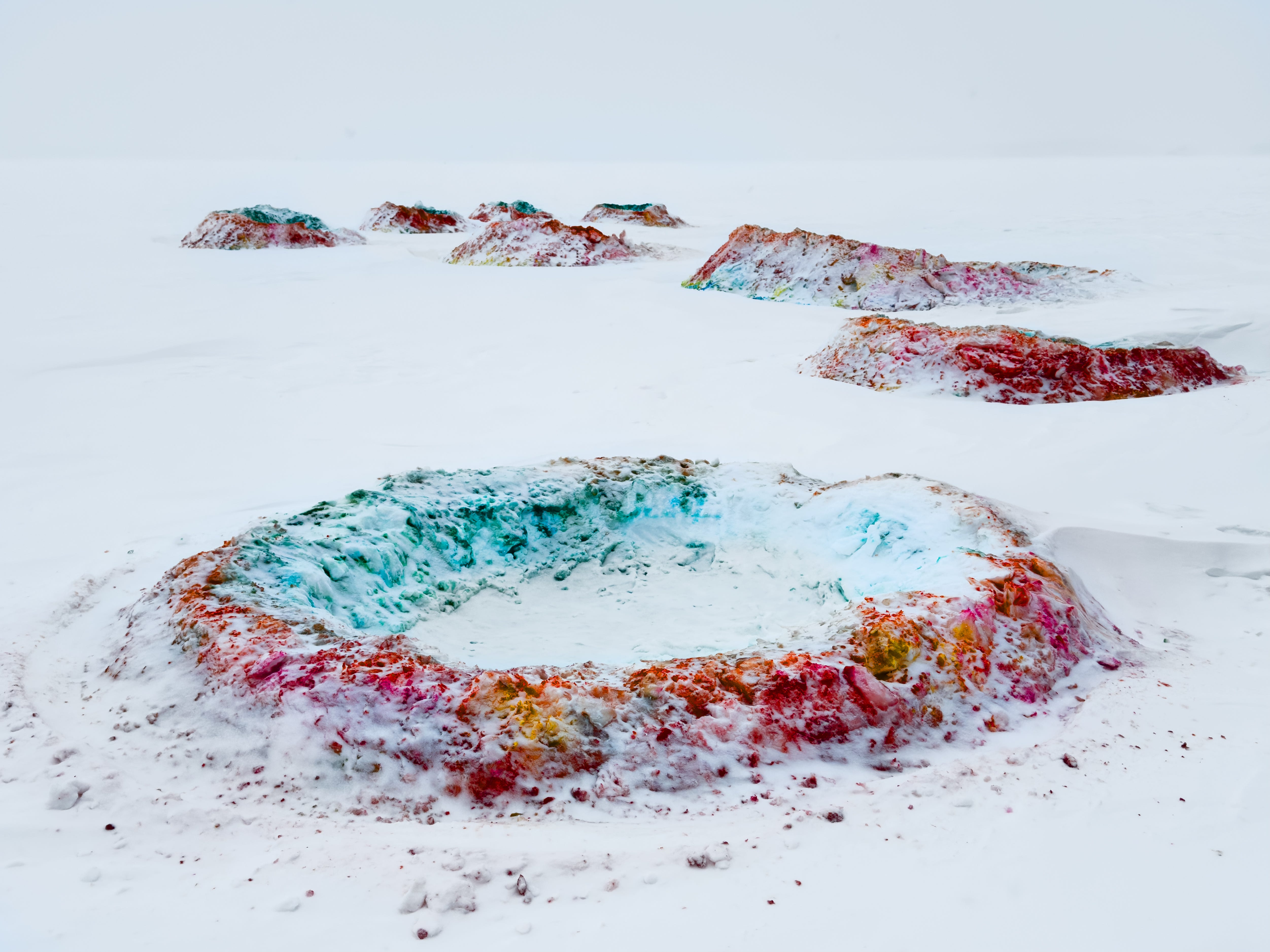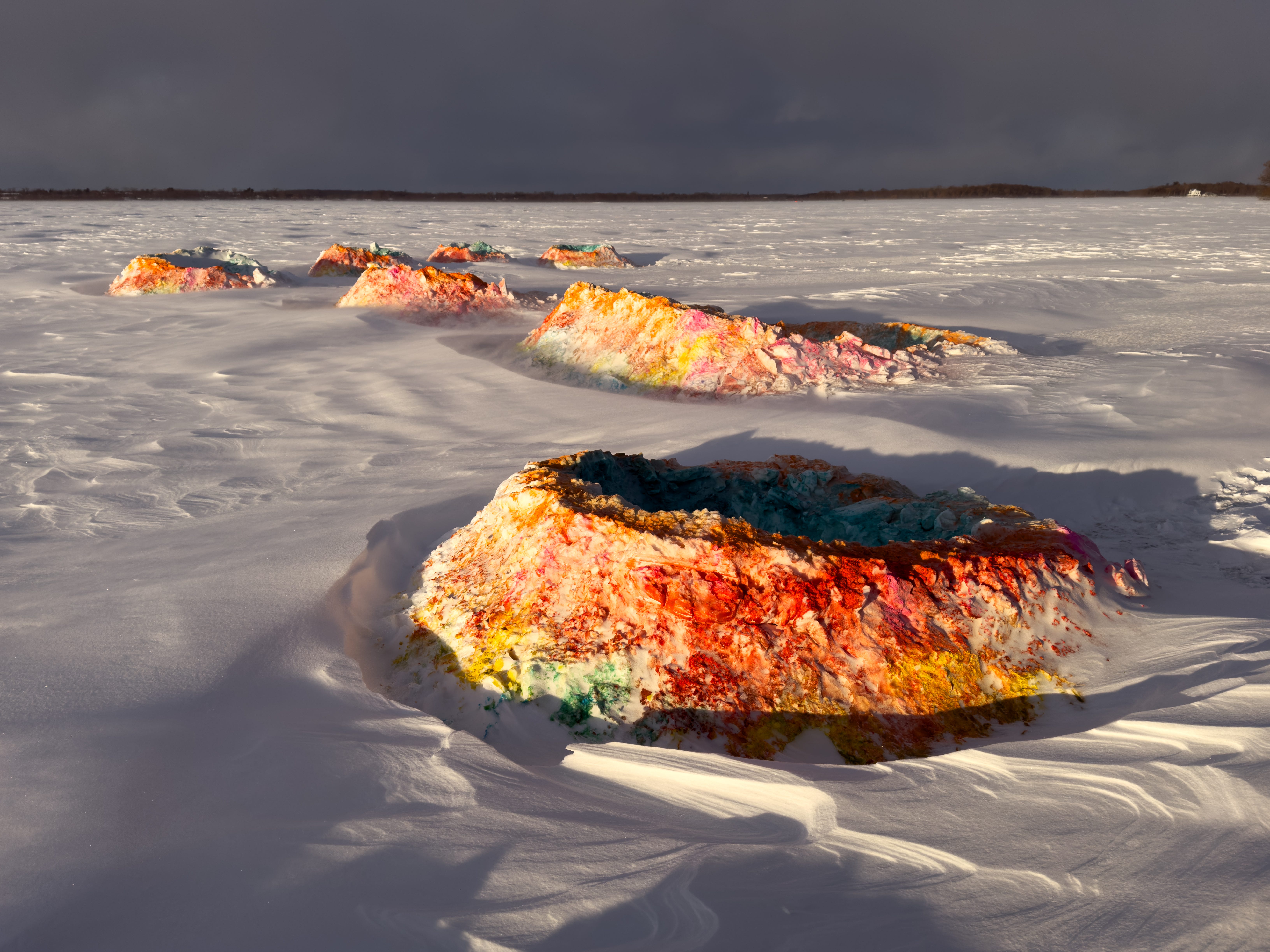 I had a vague idea that I wanted to do something like the ancient Jordan Wheels ², mysterious rings not in the sandy desert but on a plain of snow. I wasn’t sure how I’d color them (I see each weatherwork as a painting), but inspiration came around 1 pm, interiors cool, outsides hot, starting from the rim. I had sourced kitchen sifts and funnels to distribute the powder, but that was abandoned as waaaay too slow in the extreme cold (and extremer wind). Also I saw the work was being undone even as I was making it, so the spur-of-the-moment solution was to schlep out water (at 40 pounds per water container, and done 20 times) to spray over the rings to harden/strengthen them and crystalline the colors. Which worked.